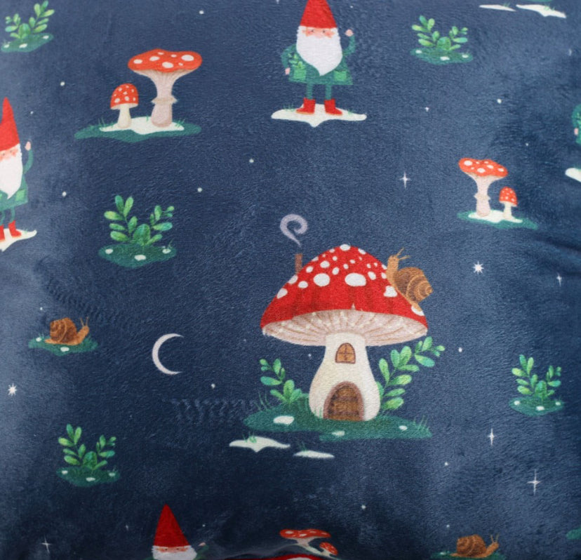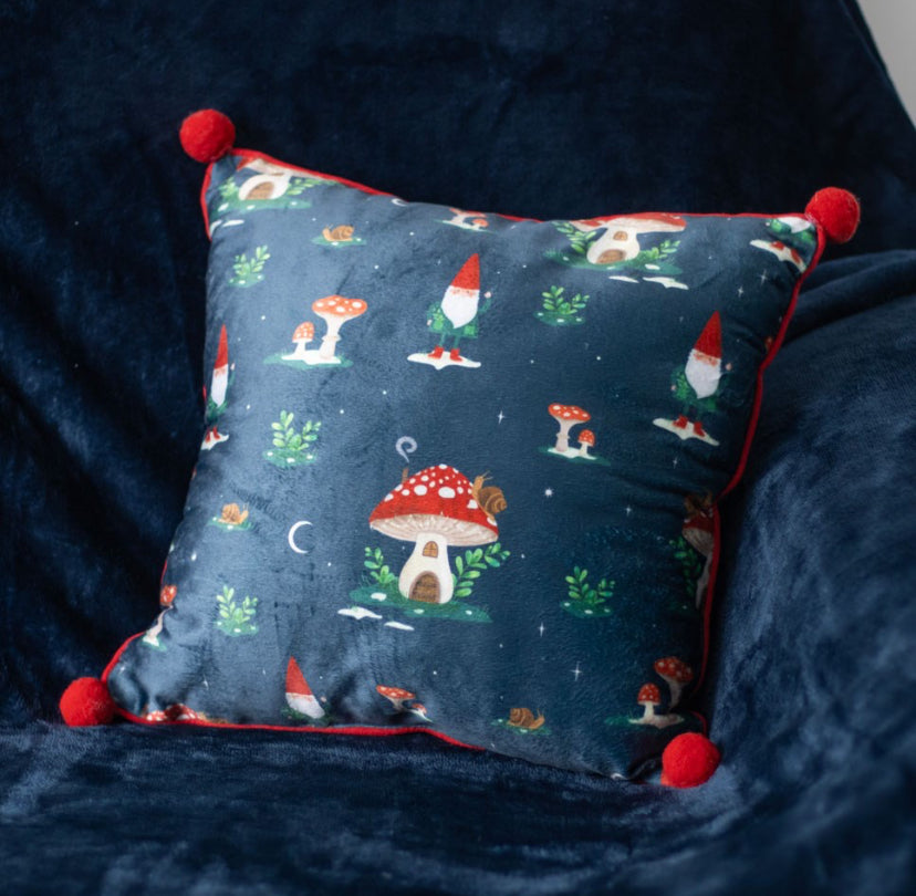 Add a touch of winter whimsy to the home with this Gnome Sweet Gnome square cushion. Featuring a charming, winter forest-inspired print including mushrooms, gnomes and snails, this cushion is adorned with playful red pom poms for a stylish and cosy addition to any room.