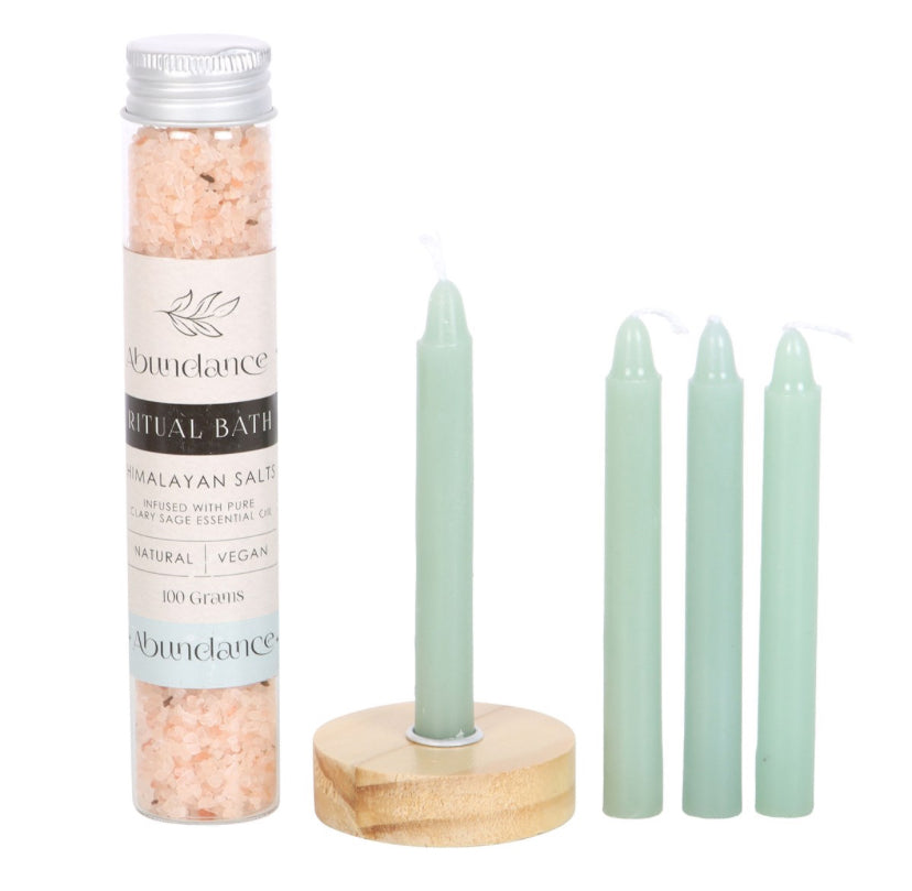 Create a sacred space for abundance, prosperity and gratitude with this Abundance Ritual Bath Kit. The kit features bath salts made from the finest Himalayan salt and infused with the calming aroma of clary sage essential oil to provide a blissful bathing experience that nurtures both your body and soul. Himalayan salt carries natural energy to restore balance, while clary sage stimulates creativity and intuition. Use the green spell candles and wooden holder as part of your bathing ritual by visualising a goal, lighting a spell candle, and manifesting the end result while indulging in a cleansing bath.