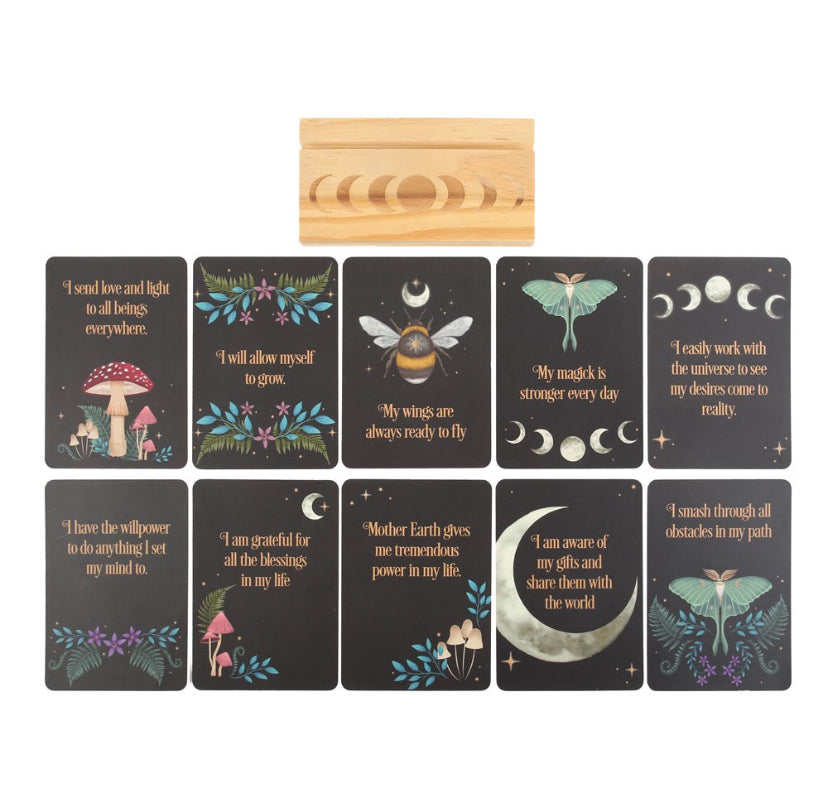 This set of 10 affirmation cards will ensure that each day is started with a sprinkle of magic and positivity. Featuring mystical forest designs with 10 inspirational messages and a wooden moon phase stand, this set makes a great display piece for a desk or side table.
