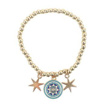 Radiate mystical style with this gold-tone beaded charm bracelet featuring an all seeing eye charm and two delicate star charms. Elasticated for a comfortable fit, it comes attached to a turquoise hanging tag with the words 'Seen, Guided, Protected'- a thoughtful token for yourself or someone special.