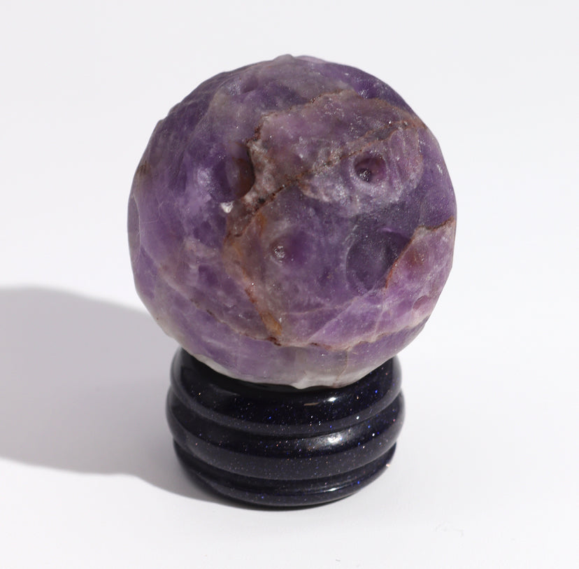 The Solar Goldstone Stand provides a grounding base for Amethyst sphere, reflecting the enigmatic beauty of the cosmos.
