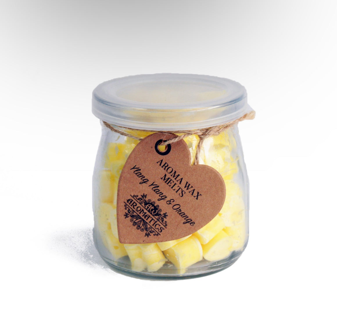 Each glass jar of Aroma Melts contain 60 wax hearts, made from PURE ESSENTIAL OILS one or two hearts melted in an oil burner will create a lovely aroma.