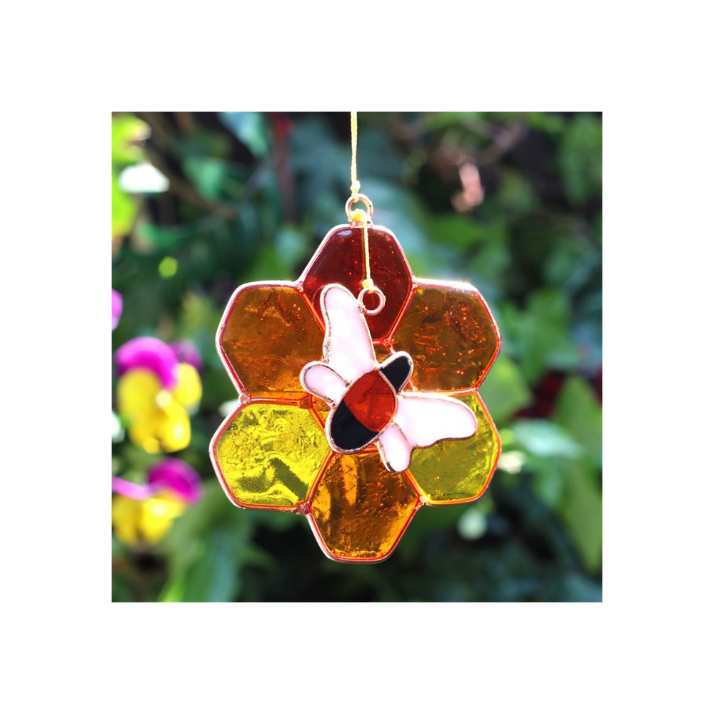 This lovely bee and honeycomb suncatcher provides a pretty way to decorate gardens, windows and conservatories. Made from resin, the suncatcher is attached to a short length of cord with a hoop for easy hanging. Hang in the window to reflect the light and bring the design to life. Product Dimensions: H14cm x W7.7cm x D0.5cm Packaged Dimensions: H9cm x W11cm x D0.7cm