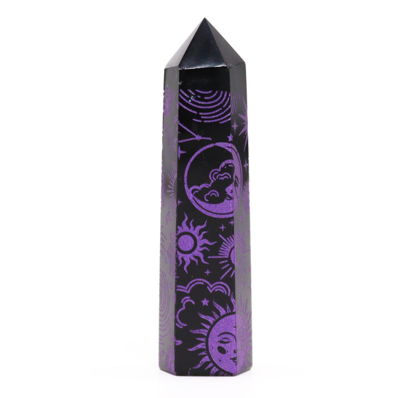 Enhance your spiritual collection with Black Obsidian Points, exquisitely designed with deep purple celestial patterns. Each point weighs approximately 60-70 grams and stands 9 cm tall, making it a versatile and powerful addition to any metaphysical toolkit.