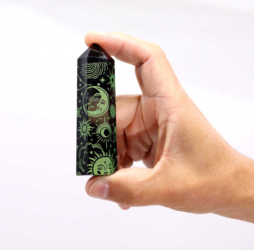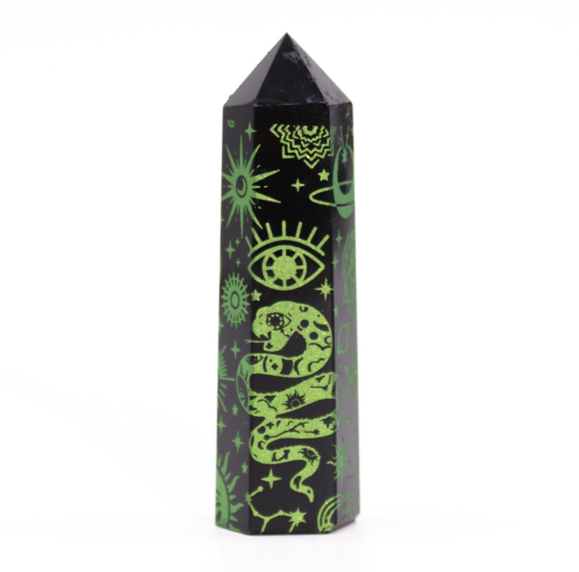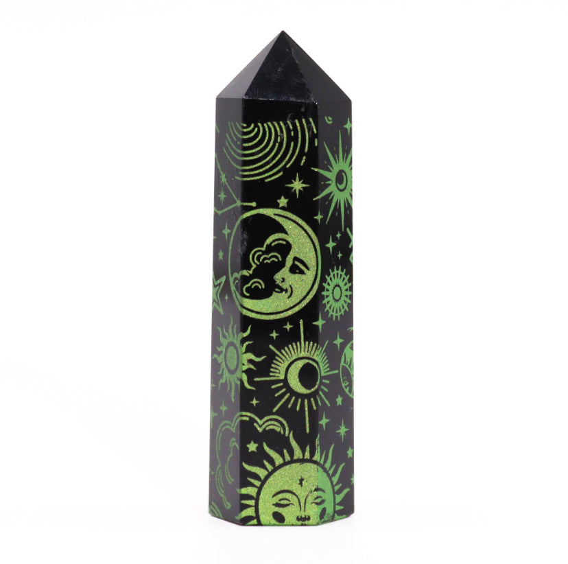 Immerse yourself in the captivating energy of Black Obsidian Points, featuring intricate forest green celestial designs. Each point, weighing approximately 60-70 grams and standing 9 cm tall, merges potent metaphysical properties with an enchanting visual appeal, ideal for both personal and professional use.