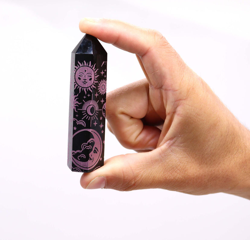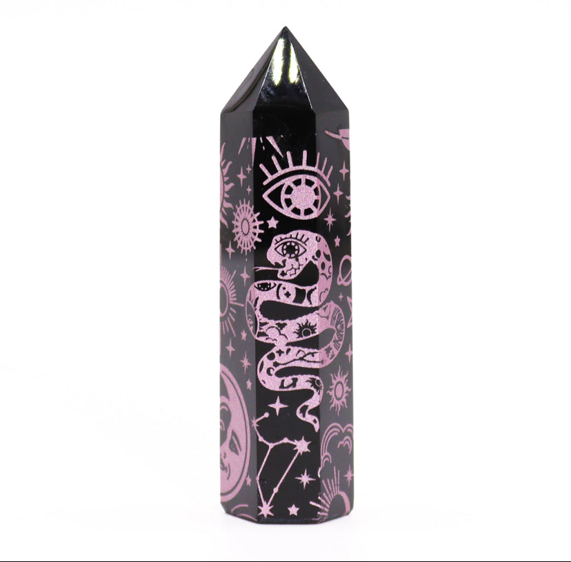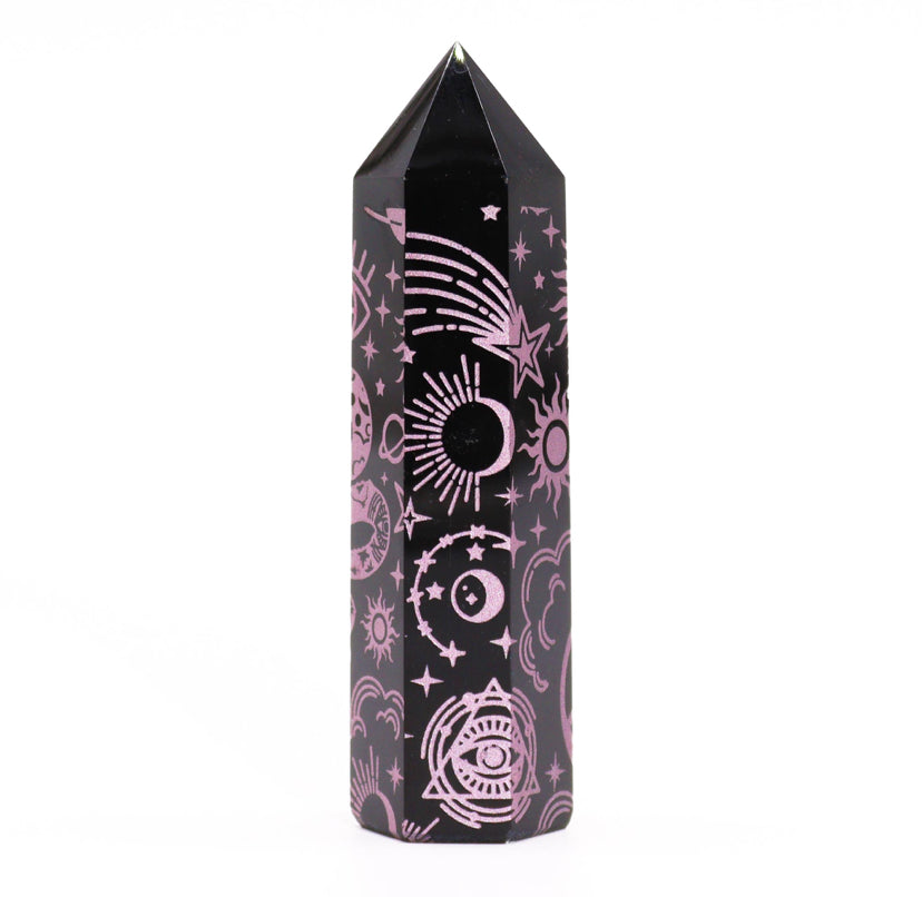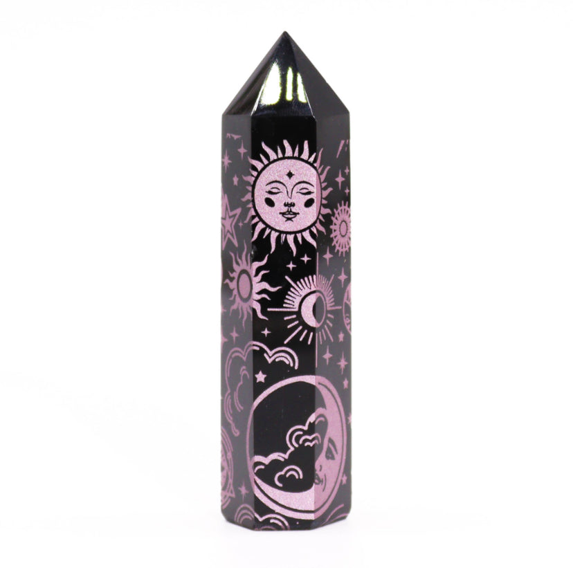 Introduce a touch of elegance and mystical energy to your collection with Black Obsidian Points, featuring delicate rose pink celestial designs. These points, each weighing around 60-70 grams and measuring 9 cm in height, combine powerful metaphysical properties with a charming aesthetic.