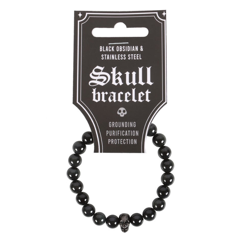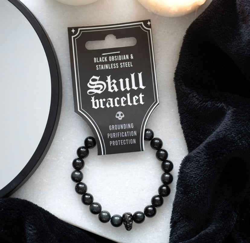 Black obsidian is often associated with protection, grounding, and the absorption of negative energy. This, paired with the skull symbol, conveys strength and resilience, embodying a bold statement of endurance and personal power.