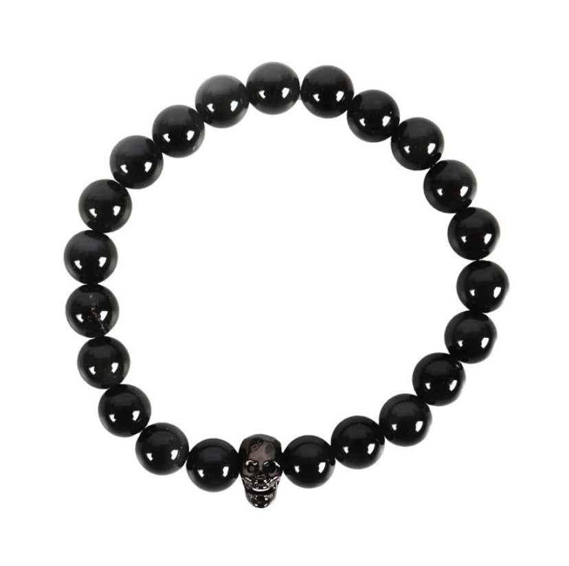 Experience the unique combination of mystique and style with this Black Obsidian Bead Bracelet, featuring an eye-catching black stainless steel skull charm. Designed with an elasticated band, this bracelet ensures a comfortable and flexible fit for any wrist.