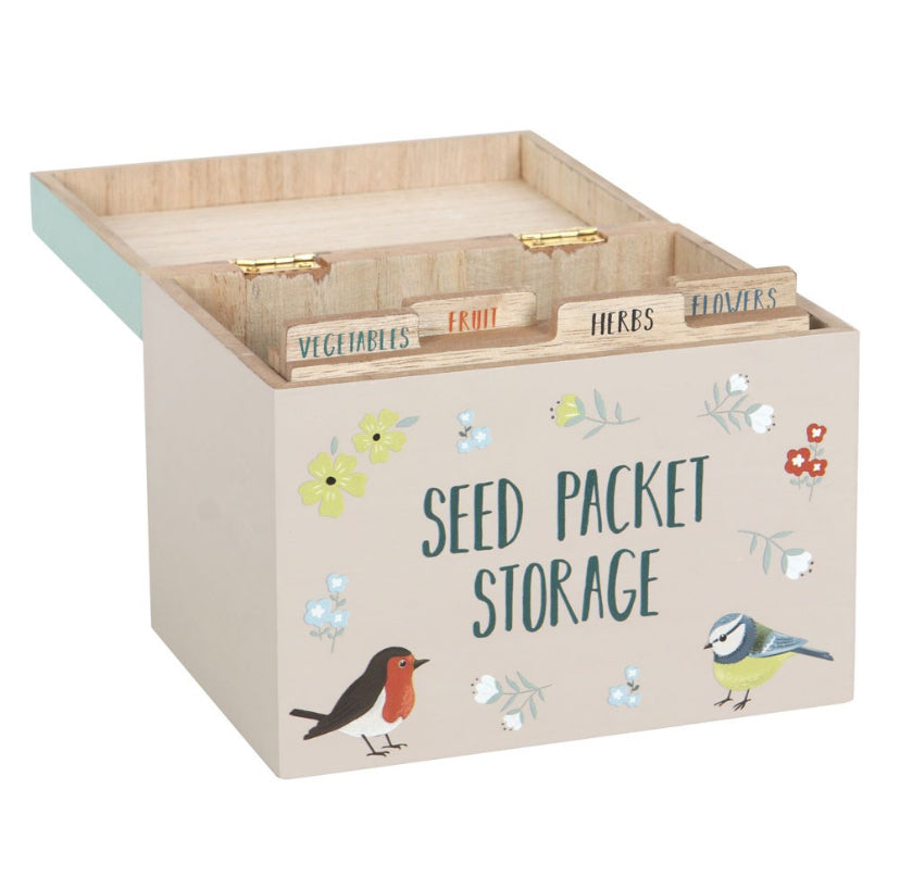 Keep all of your garden seeds in one place with this sweet seed packet storage box. Features 'Seed Packet Storage' text and 4 adorable illustrations of garden birds commonly found in British gardens; a Blue Tit, Robin, Goldfinch and Bullfinch.