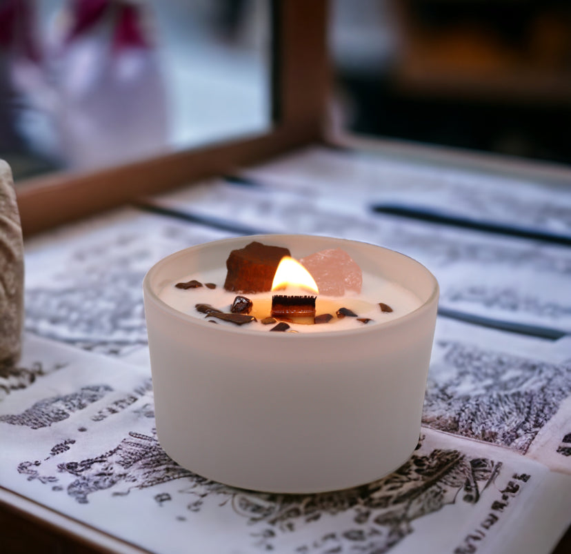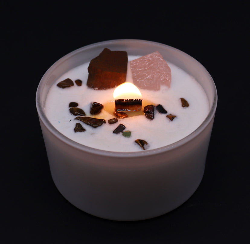 Light this candle to create a warm and inviting atmosphere that fuels your creative spark. Let the fragrance of "Invoking Dreams" inspire your imagination, while the energy of Tiger Eye and Rose Quartz crystals nurtures your emotional well-being.