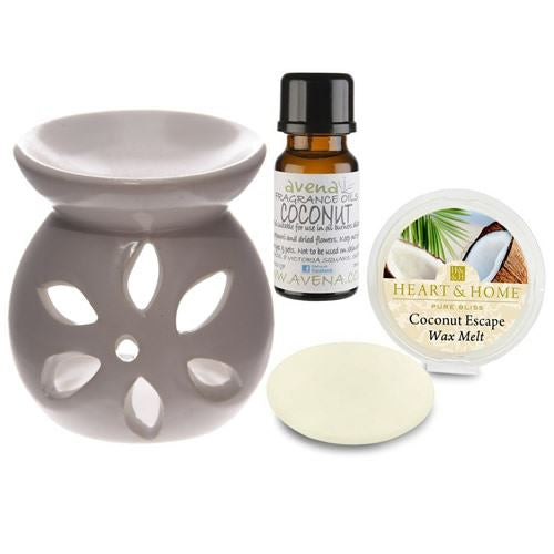 This beautiful ceramic oil burner is painted white and glazed to give it a wonderful looking sheen, along with a floral pattern cut out of the centre which creates a wonderful effect when the flickering candle light escapes through these cut-out holes. also includes a 10ml bottle of our full-strength Coconut Fragrance Oil and a Coconut Wax Melt making it an amazing value and wonderful gift idea for someone who is a lover of burning oils.