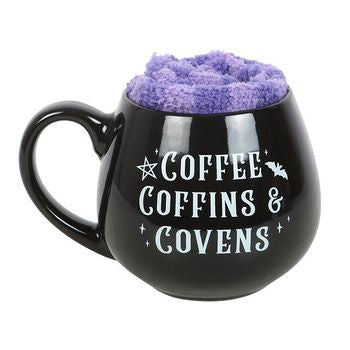 Get comfy in true witchy style with this cauldron-shaped mug and fluffy socks gift set featuring the phrase 'Coffee, Coffins & Covens'. The 450ml mug is perfect for a warming drink, while the soft purple socks add ultimate comfort for spell-casting Sundays or spooky movie nights.