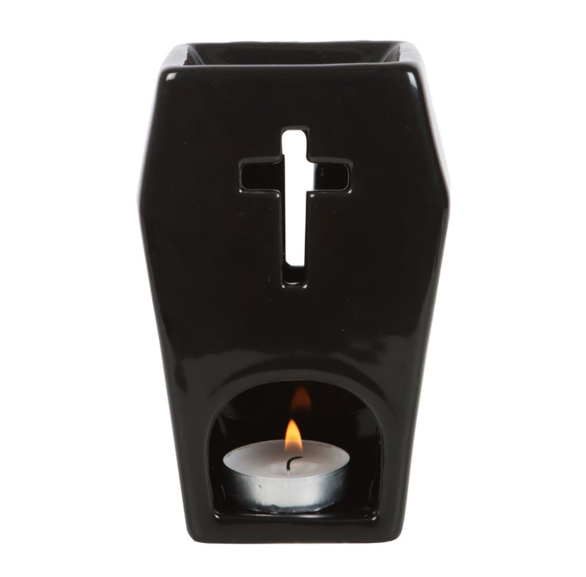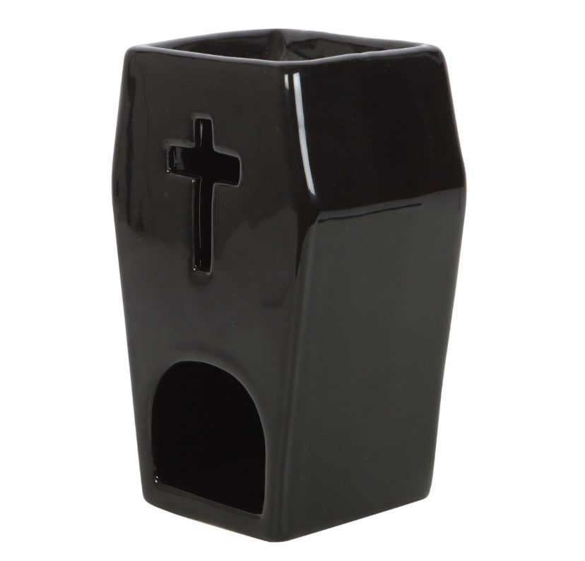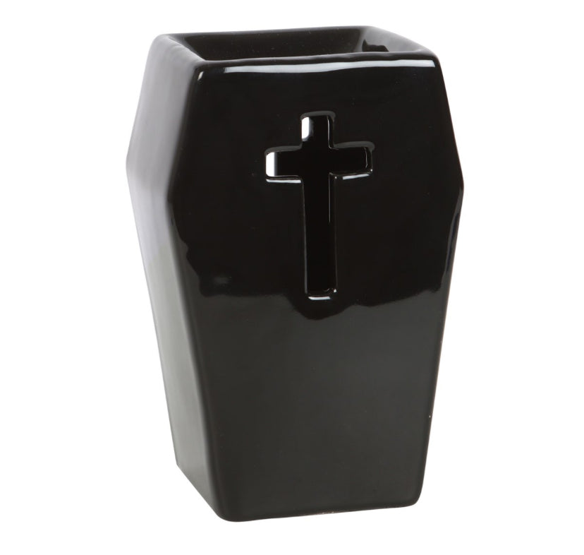 This unique coffin oil burner is perfect for those who appreciate gothic style and unconventional decor. When a lit tealight is placed inside, the cut out cross design is illuminated, casting ambient light and shadows around the room. A great statement piece for the home.