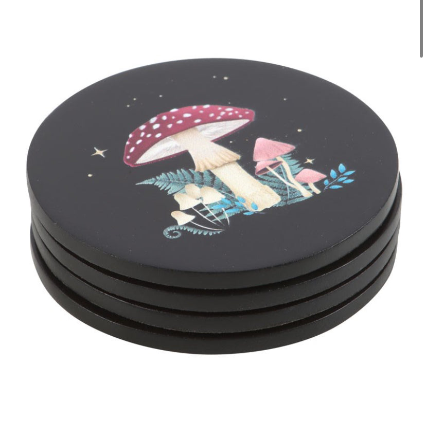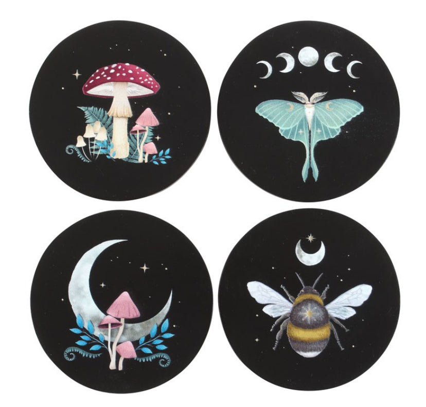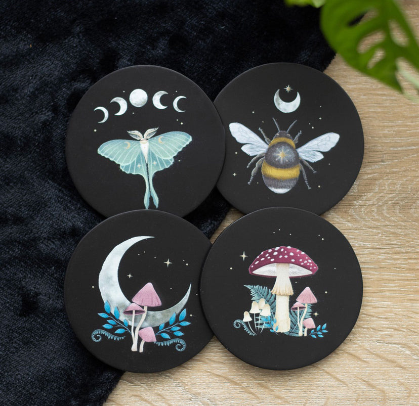 This enchanting set of coasters features dark forest details, including a lush mushroom landscape, a luna moth accented by moon phases, a pastel mushroom cradled by a crescent moon, and a bumblebee under a twinkling starlit sky.
