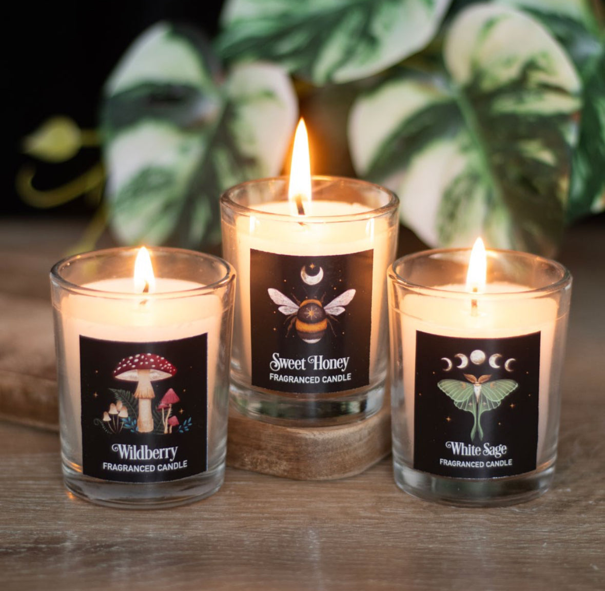 This lovely set of fragranced votive candles comes in 3 scents reminiscent of mystical forests. With illustrations of moonlit mushrooms, golden bees and stunning luna moths, this set makes a beautiful gift for lovers of the dark and magical.