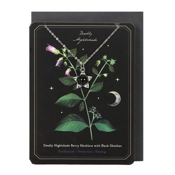 Add a touch of dark elegance to your jewellery collection with this stainless steel necklace. Featuring a delicate Deadly Nightshade berry charm paired with a striking black obsidian stone, it comes beautifully presented on a themed greeting card.