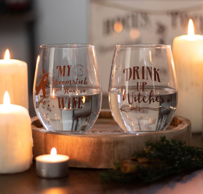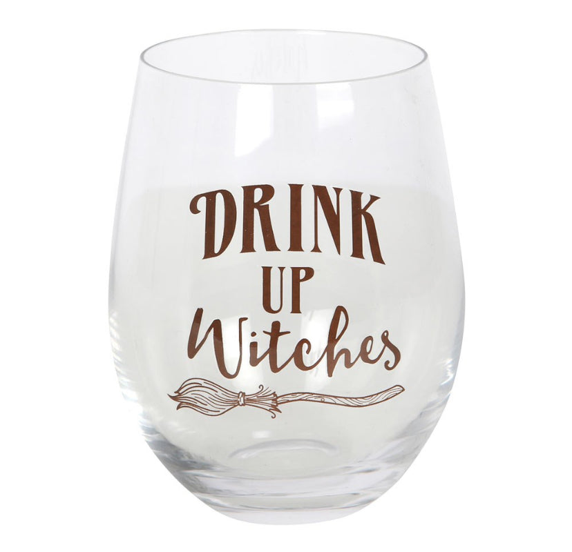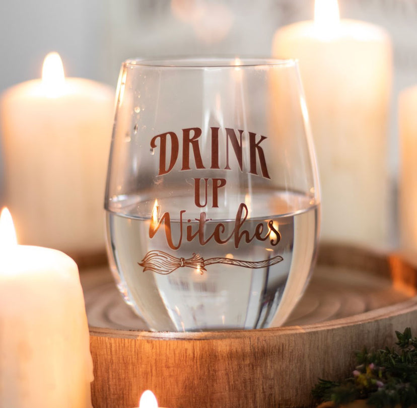 Perk up your next coven meeting or girls' night in with this fun stemless glass that's perfect for wine, gin or other potions and tonics. Features a whimsical broomstick illustration with 'Drink up witches' text. 500ml capacity. Hand wash only.