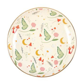 Keep jewellery and little treasures safe in this round ceramic trinket dish decorated with a whimsical garden fairy print.