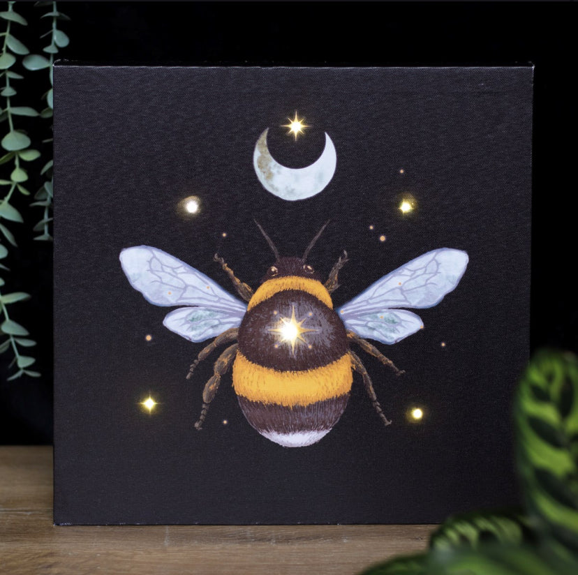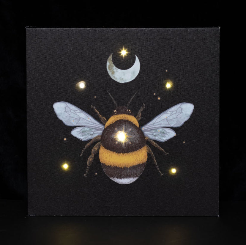 Add a touch of magic to your space with this 30x30cm light-up wall canvas. Features an ethereal forest bee illustration with embedded LED lights to create a mesmerizing glow. Requires 2 x AA batteries.