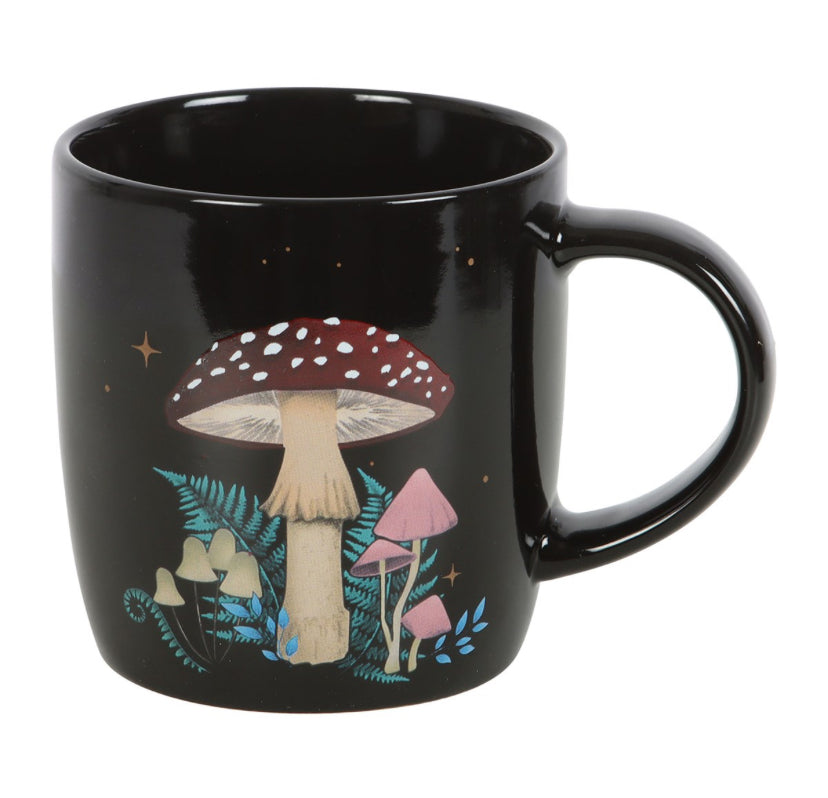 Add a touch of enchantment to your morning cuppa with this dark forest mushroom ceramic mug. This black ceramic mug features a captivating and intricate mushroom design, including a crescent moon and stars.