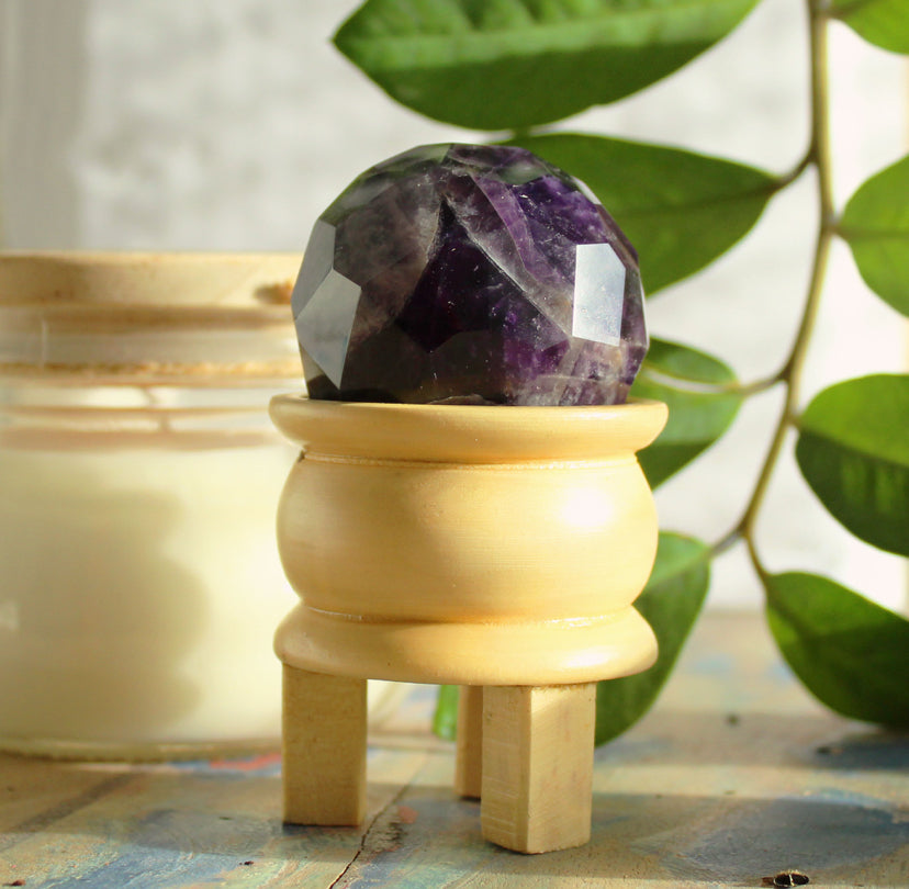 Amethyst Faceted Healing Ball, is a gemstone that promotes peace and clarity. It comes with a wooden stand in a light brown colour.
