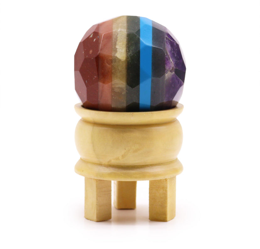 Seven Chakra Gemstone Faceted Healing Ball - a unique fusion of nature's finest minerals, each holding its own symbolism and energy. Paired with charming wooden stands in a light brown shade.