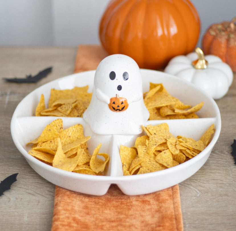 Add a ghostly charm to any snack table with this adorable ghost with pumpkin chip and dip snack dish. Designed for Halloween gatherings or autumnal parties, this plate features a playful ghost at the centre that cleverly covers the dip. Surrounding the ghost are white ceramic sections shaped perfectly for chips, veggies, or other snacks. Product is food safe, not suitable for microwave use, handwash only.