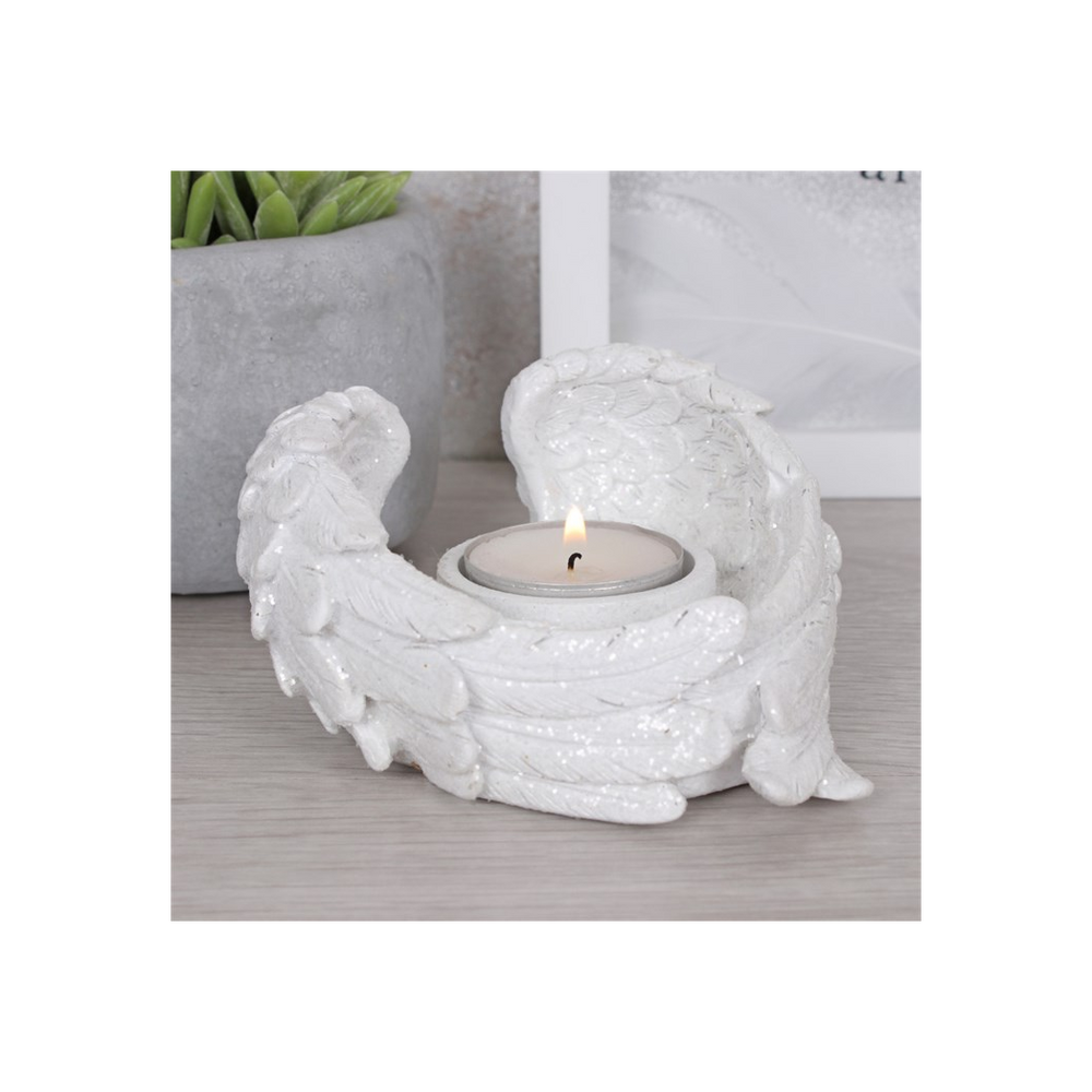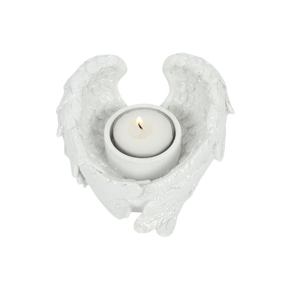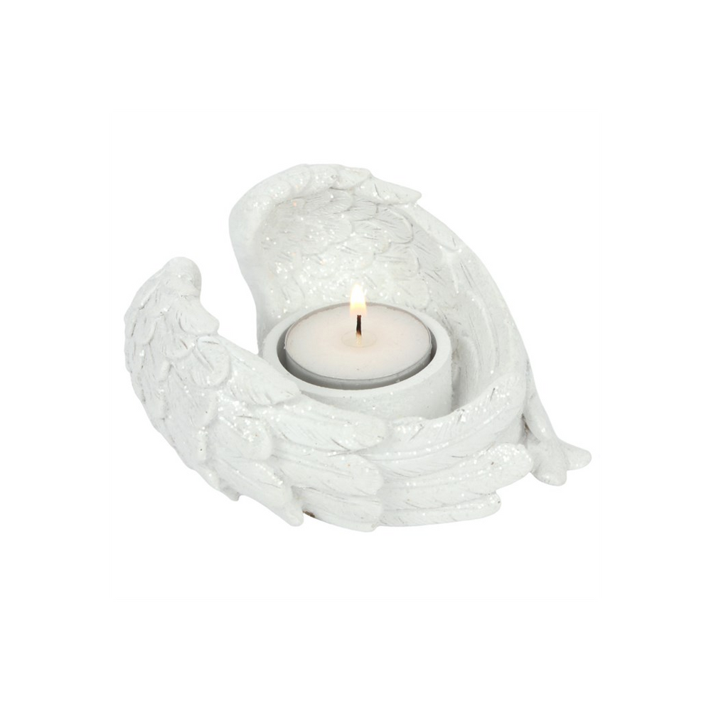 A beautiful candle holder for tealights or small votives. This pair of angel wings is dusted in clear glitter flakes which give a gorgeous sparkly finish when caught in the candlelight. Product Dimensions: H5.5cm x W11cm x D11cm Packaged Dimensions: H5.5cm x W11cm x D11cm