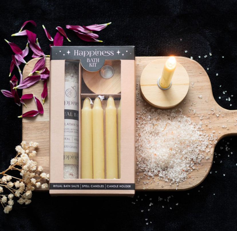 Create a sacred space for happiness, positivity and contentment with this Happiness Ritual Bath Kit. The kit features bath salts made from the finest Himalayan salt and infused with the uplifting aroma of lemon and ginger essential oil to provide a blissful bathing experience that nurtures both your body and soul. Himalayan salt carries natural energy to restore balance, while lemon and ginger provides a sense of grounding and vitality. Use the yellow spell candles and wooden holder as part of your bathing ritual by visualising a goal, lighting a spell candle, and manifesting the end result while indulging in a soothing bath.