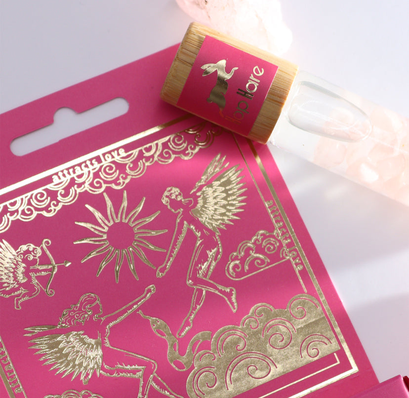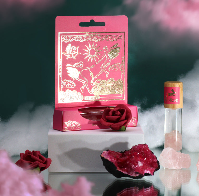 Crafting the Love Story: "The Lovers" by Hop Hare, a quintessential essential oil gemstone roll-on crafted to beckon love and kindle the flames of passion. Each bottle is a harmonious concoction of nature's most enchanting fragrances, married with the loving energy of Rose Quartz gemstones.
