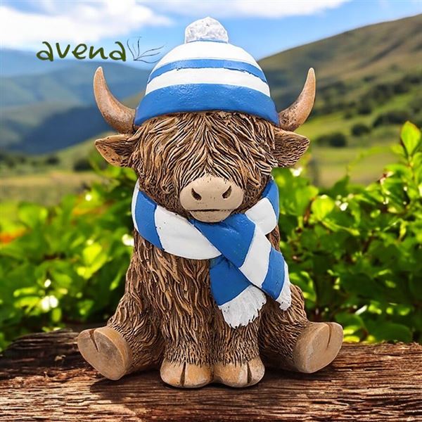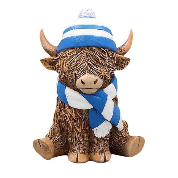 This charming Highland Cow ornament is wearing a blue & white football-themed hat & scarf, making it an ideal gift.