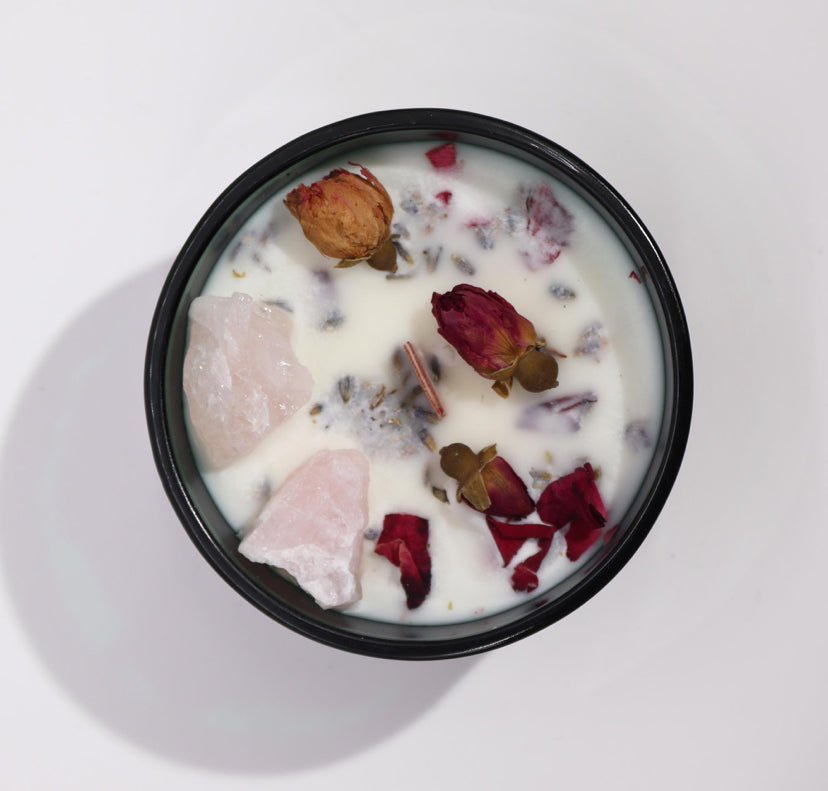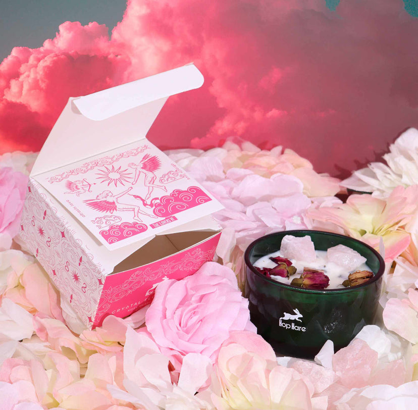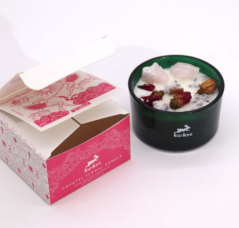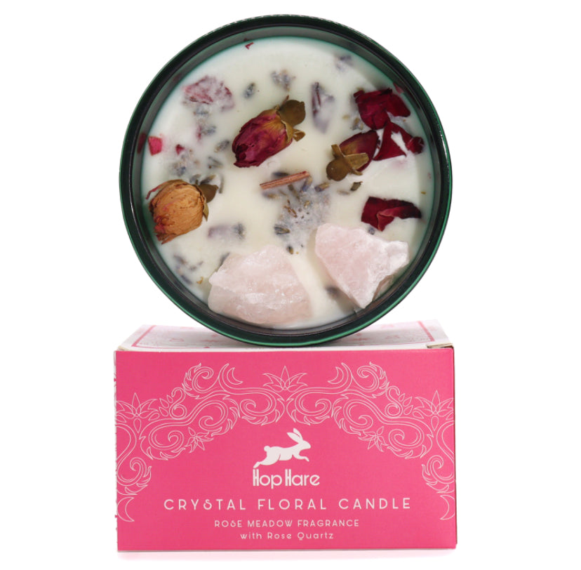 Indulge in the enchanting allure of Hop Hare Crystal Magic Flower Candle - The Lovers, a fusion of Rose quartz and delicate Rose Flowers.