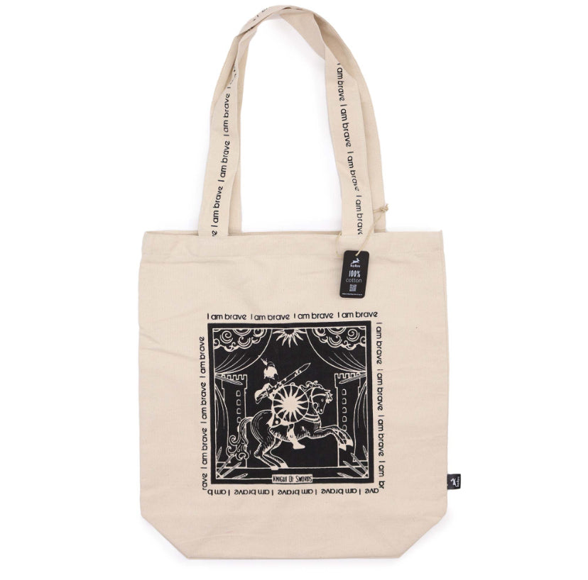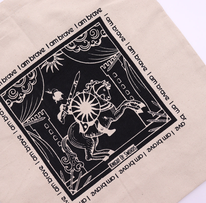The design of the Knight of Swords tarot card adorns this tote, symbolizing swift action, mental clarity, and fearlessness in the face of challenges.