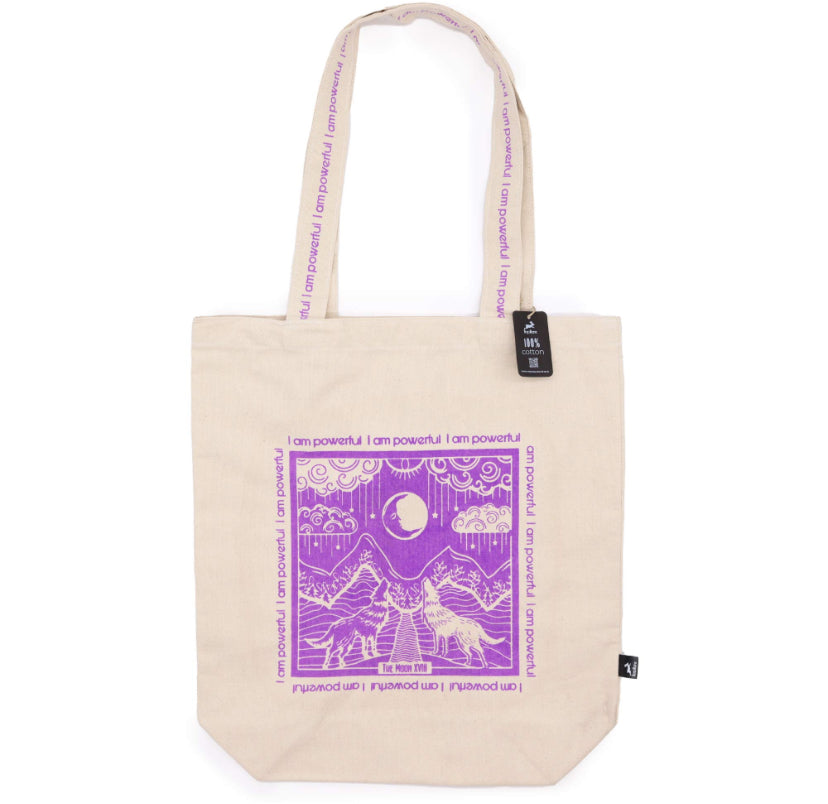 This design showcases The Moon Tarot Card, a symbol of mystery, intuition, and the subconscious mind. The moon's connection to the tides reflects the vast potential within us. Paired with the affirmation "I am powerful," this tote bag empowers individuals to tap into their inner strength and wisdom. The tarot theme adds a touch of mystery and intrigue, perfect for those interested in esoteric or spiritual practices.