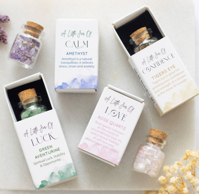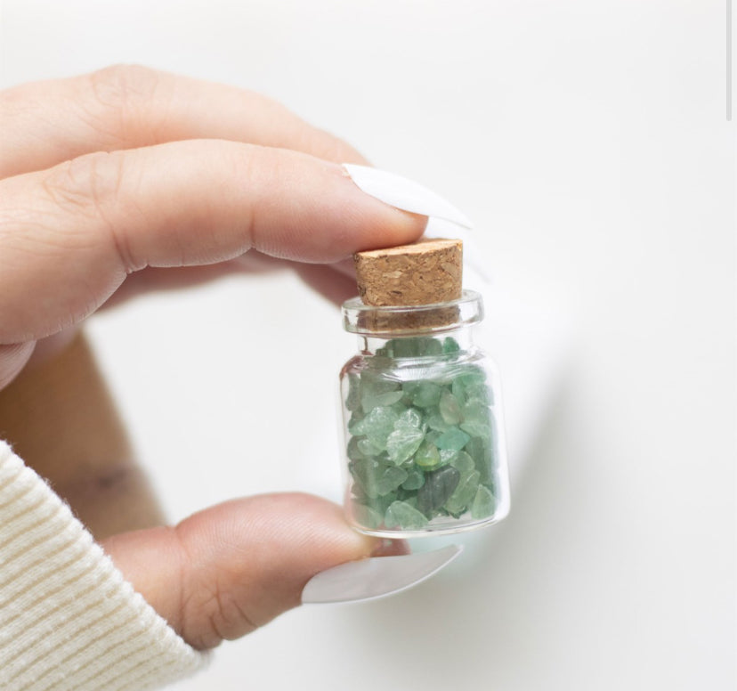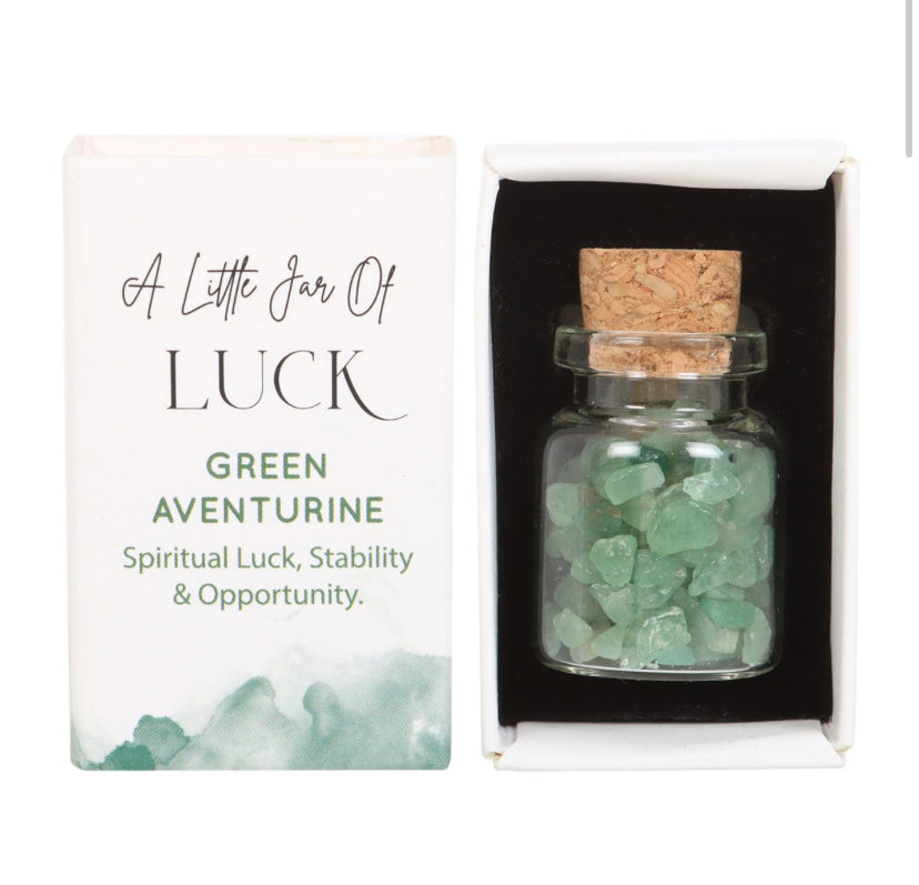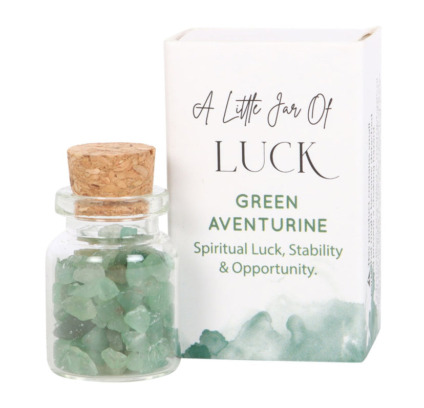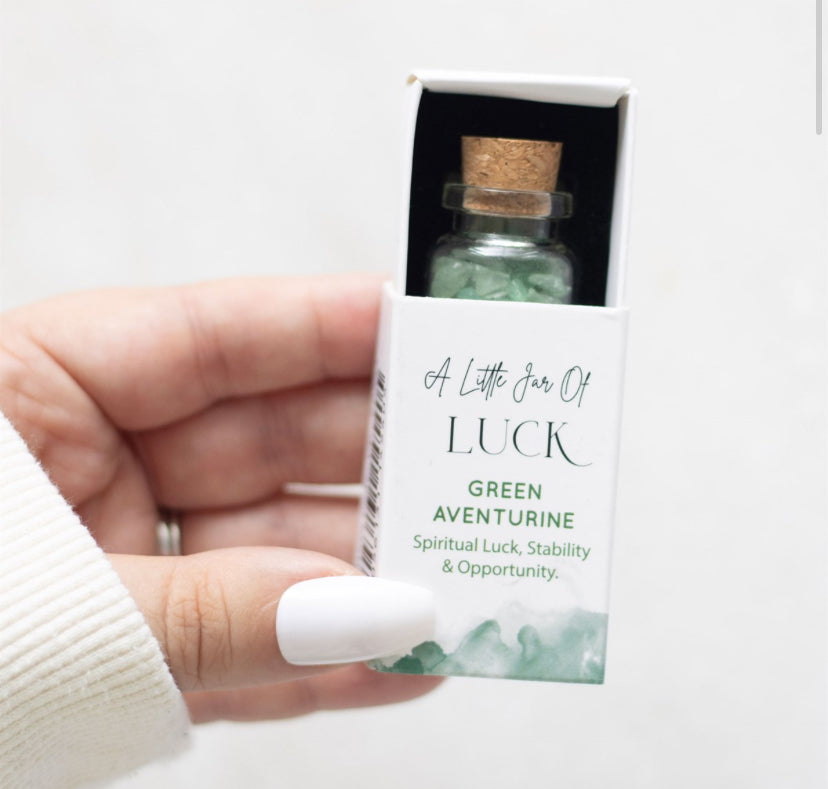 This pocket-sized Jar of Luck holds green aventurine crystal chips, known for their spiritual properties of attracting luck, stability and opportunity.