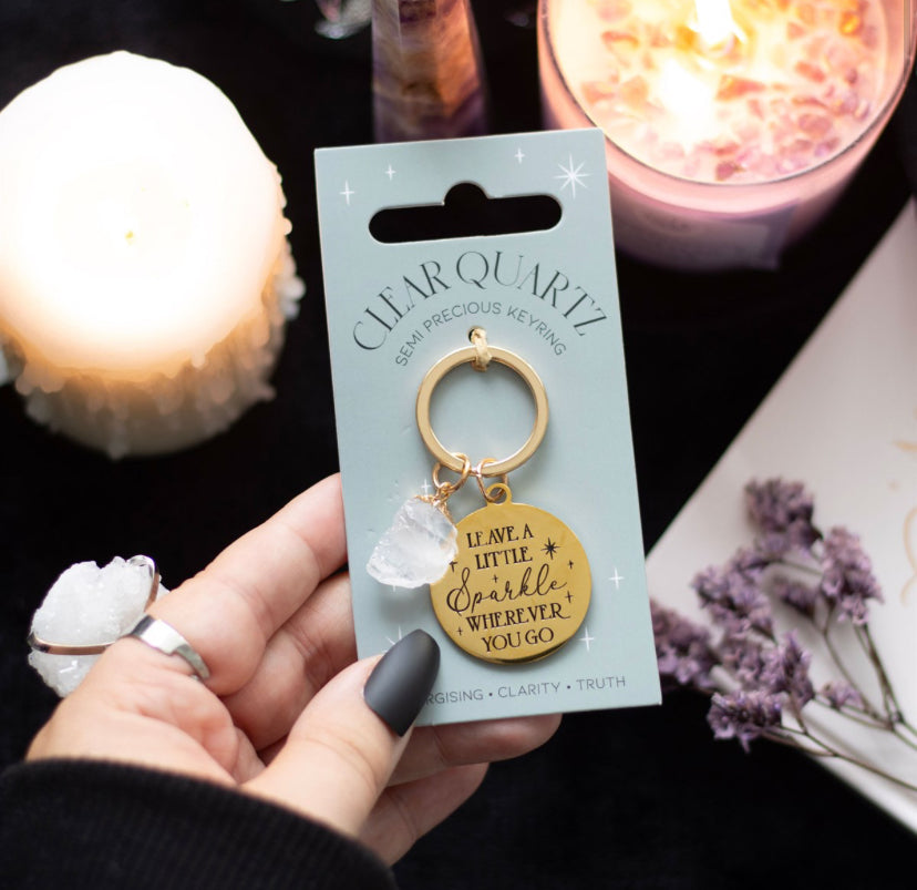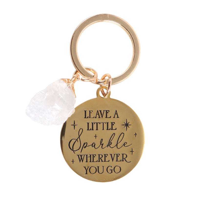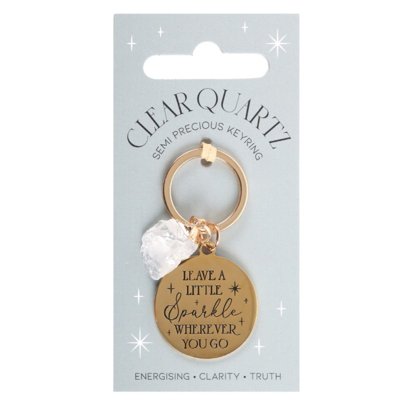This clear quartz crystal keyring features motivational 'Leave a little sparkle wherever you go' text accented by a hanging crystal charm on a matching backing card. Clear quartz is a powerful semi-precious stone believed to promote clarity and boost energy.
