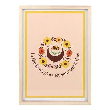 This framed print features a Summer Solstice-inspired design of a bee, sunflowers, and crescent moon, and an inspirational text: "In the Sun's glow, let your spirit flow.". The wooden frame adds a rustic touch, perfect for displaying in a bedroom, living room or office space as a gentle reminder to embrace the season's vibrant energy. Sawtooth hangers on reverse.