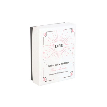 Give the gift of crystal magic with this miniature potion bottle necklace. With natural rose quartz crystal chips and a cork stopper, this necklace serves as a spellbinding accessory while attracting love, friendship and confidence. Presented in a matching gift box and perfect for that special witch in your life.