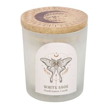 Designed for enhancing positive energy, this manifestation candle is infused with the earthy and uplifting aroma of white sage. The frosted glass features a luna moth design and complimented by a cork lid and accented with clear quartz crystals which improves clarity of the mind and intuition for manifestation and relaxation. The crystal will release from the wax with use and can be later reused for a multitude of spiritual purposes. Approximate burn time of 28 hours. Please practice caution when burning and never leave a lit candle unattended.