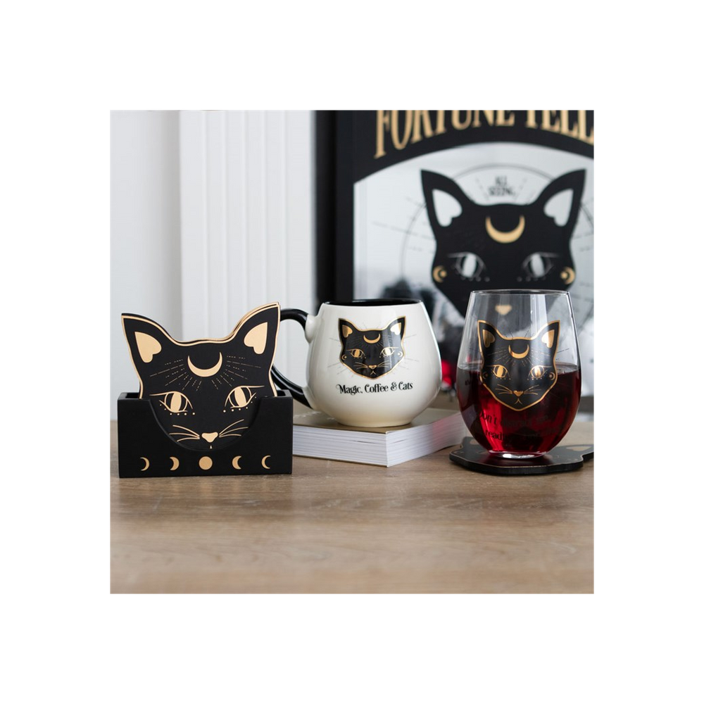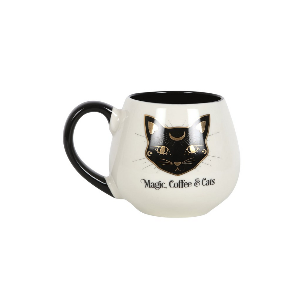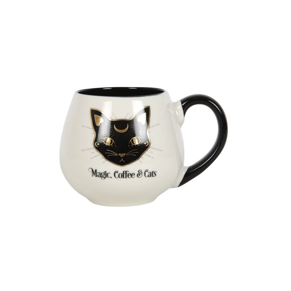 This magickal mug makes a great addition to any witch's kitchen. Features a mystical black cat design with gold tone accents and 'Magic, Coffee & Cats' text. 500ml capacity. Dishwasher and microwave safe.