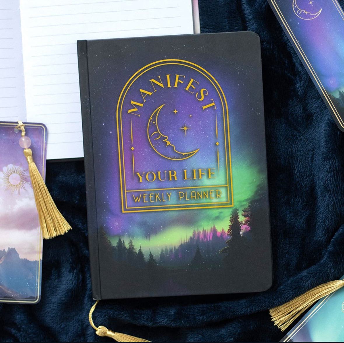 Stay organised and inspired with this magical A5 weekly planner notebook designed to uplift your spirit with every page. The cover features a captivating forest scene with the words 'Manifest your life' and a delicate moon image in gold foil. Holographic edging adds a hint of charm while a gold tassle page marker is a handy addition to easily find your place. Ideal for setting intentions and planning the week ahead, this notebook combines beauty and purpose—perfect for anyone ready to bring their dreams to life.