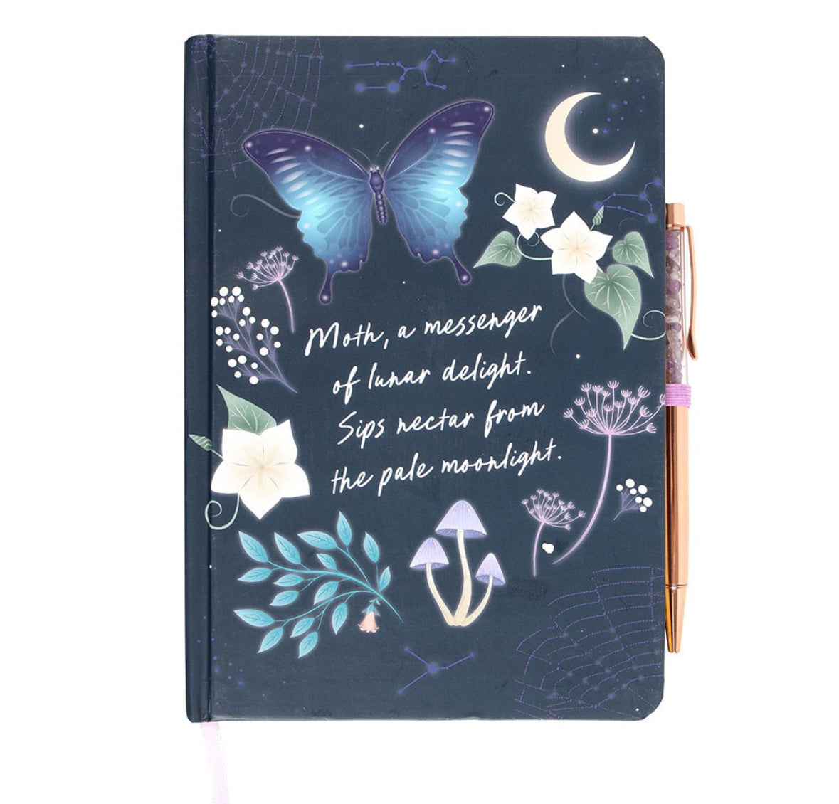 This journal makes the perfect place to keep track of hopes, dreams and intentions. Featuring a midnight moth design surrounded by a beautiful night's sky and forest plants, this journal comes with an elegant amethyst crystal chip ballpoint pen.
