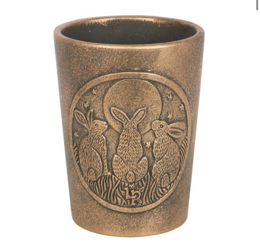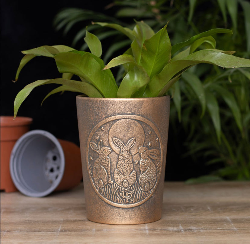 The striking motif of three moon-gazing hares is commonly used to represent fertility and growth. The plant pot is beautifully detailed and adds a touch of mystical charm to any space. This terracotta plant pot has been finished in an antiqued bronze effect.