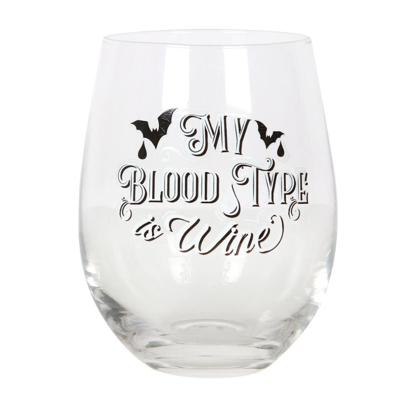 This stemless wine glass features 'My Blood Type is Wine' text with gothic bat designs. Perfect for sipping red wine after a long night of mischief. 500ml capacity. Do not microwave. Hand wash only.