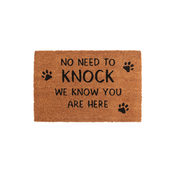 The mat reads 'No need to knock we know you are here' surrounded with cute paw print designs.