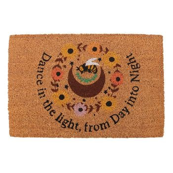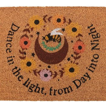 Welcome the season with this natural Summer Solstice-inspired coir doormat. Featuring a crescent moon. bee, and sunflower design with the uplifting text "Dance in the light from day into night", this doormat adds a rustic touch to any entryway while celebrating the vibrant energy of the solstice.