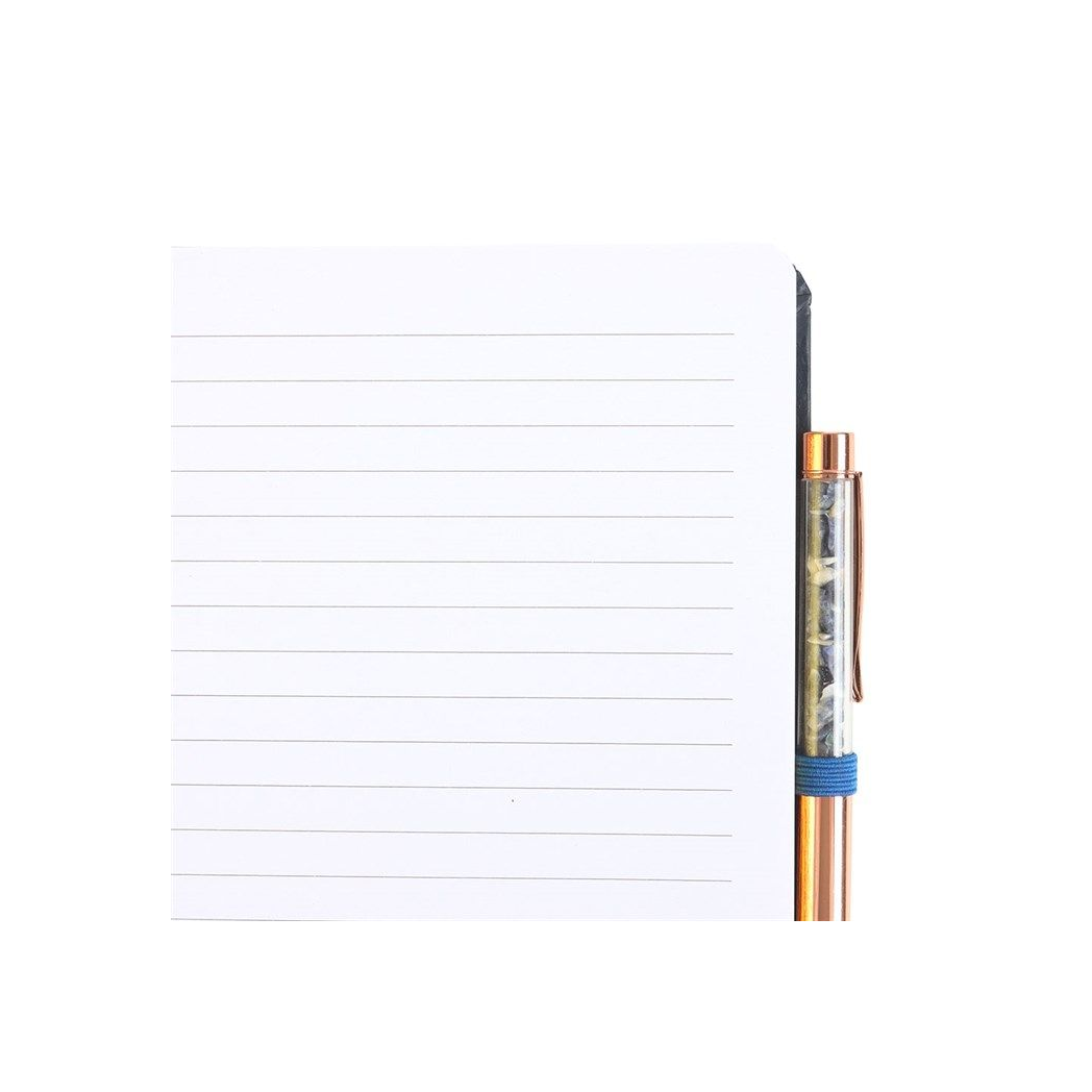 This journal makes the perfect place to keep track of hopes, dreams and intentions. Featuring a flying night owl design surrounded by a beautiful night's sky and forest plants, this journal comes with an elegant sodalite crystal chip ballpoint pen.