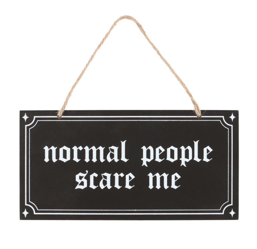 Embrace your quirky character and let your unique traits be known with this gothic style hanging sign which reads 'Normal People Scare Me'.