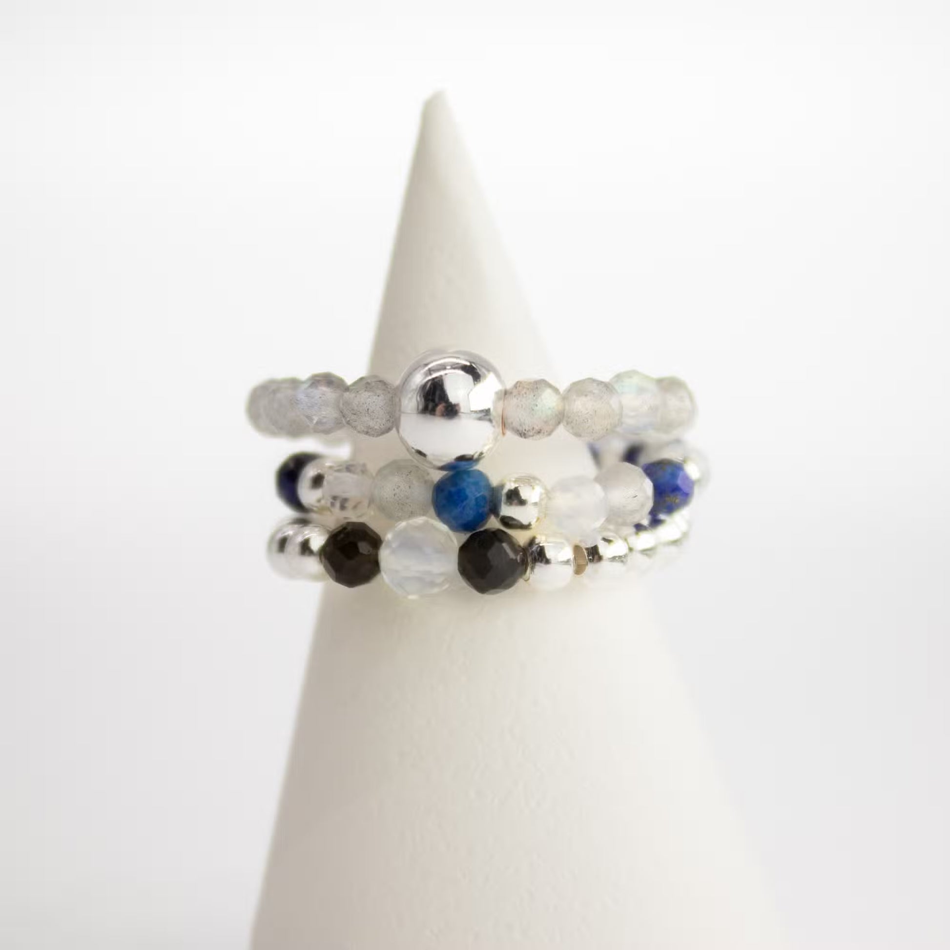 The set features real gemstones including labradorite, lapis lazuli, opalite, and black obsidian. Labradorite brings subtle depth and movement, lapis lazuli adds rich blue contrast, opalite offers a soft glow, and black obsidian grounds the look. Polished silver-tone beads add clarity and balance across the trio.
