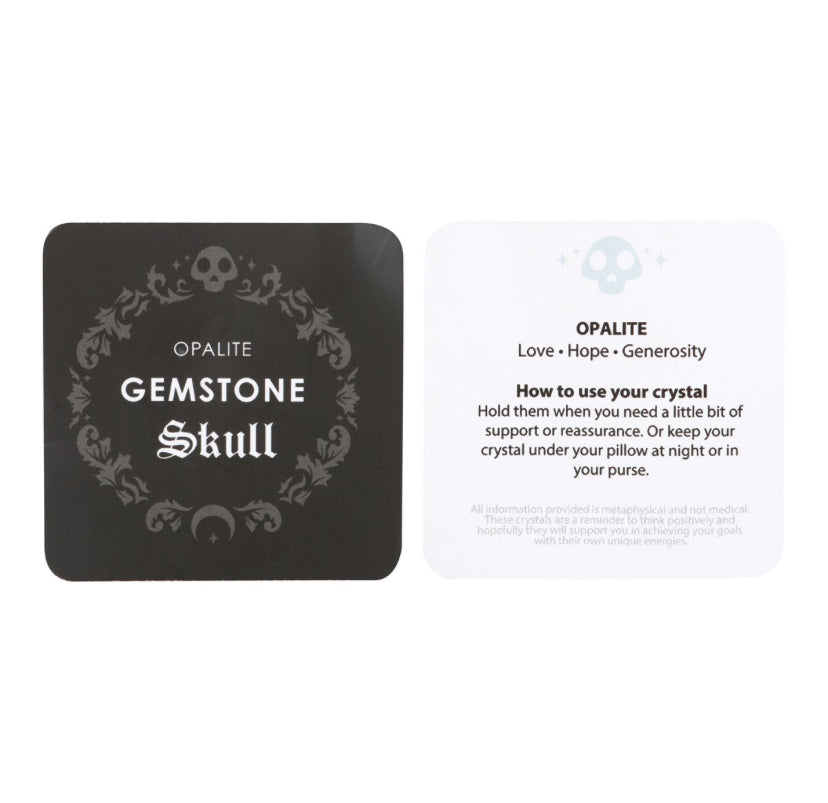 This crystal skull is made from opalite which is a stone renowned for its ability to evoke feelings of love, hope, and generosity.